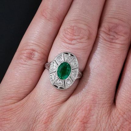 A luscious, richly saturated, deep-green emerald, weighing 1.25 carat, is intriguingly cut with an oval outline and an octagonal step-cut faceting. This gorgeous bezel-set gemstone is set in platinum in the center of a radiating diamond-set frame, enhanced with decorative openwork and finely milgrained edges. The top of the ring shank is adorned with neo-classically inspired hand engraving and the undergallery is imbued with an open scalloped motif.
