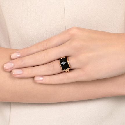 A beauty from the past and yet so thoroughly modern, this uber chic ring presents a glossy arc of harlequin-faceted black onyx, bezel-set and accented by distinctive crisscross shoulders. A dash of drama for your hand. Hand fabricated in 10K gold, circa 1930. Forever and always a size 6.