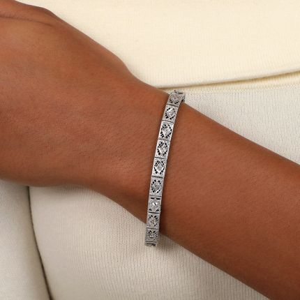 Crisply die-struck and hand finished in bright 14K white gold, circa 1920s-30s, twenty-one old mine-cut, European-cut, and single-cut diamonds--totaling 1.10 carats--sparkle from within harlequin settings framed by fancy geometric filigree links, in this eminently wearable Art Deco wrist bauble. Measures 7 inches long.