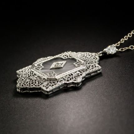 A radiant, diamond-pierced frosted rock quartz crystal plaque is surrounded by a fanciful frame of intricate filigree, and suspends from a (newer) bail set with a pear-shaped diamond, in this delightful Depression-era adornment. Rendered in 10K white gold, the chain measures 16 1/2 inches.