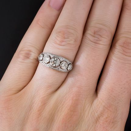 A coruscating quintet of collet-set European-cut diamonds, totaling just shy of one carat, floats across this original early-Art Deco band ring, finely hand fabricated in platinum - circa 1920. The five flashing stones are bordered by tiny twinkling rose-cut diamonds. A rare original beauty in a finger size 6.