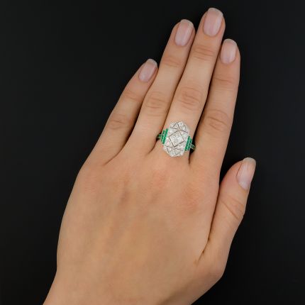 A real finger-hugger, this gorgeous Art Deco delight is centered by a dazzling white .45 carat French-cut diamond which appears to float within a diamond-studded array of geometric shapes, forming an elegant, elongated hexagon. Stepped rows of ultra-vivid and glittering square-cut emeralds accent the sides of this lovely composition and adorn the shoulders of the currently size 9 ring shank. Stunning. Total diamond weight, .95 carat; total emerald weight, .70 carat. Hand fabricated in platinum.