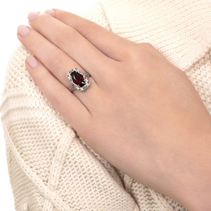 Glimmering and glowing with a rich Cabernet wine color, the striking 4.00-carat hexagonal-shaped garnet in this alluring Art Deco ring is surrounded--in beautiful contrast--by an intricately crafted lacy filigree mounting. An uncommon beauty. Die-struck in 14K gold, circa 1930, currently ring size 6 1/2+.