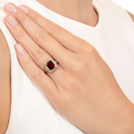 Every day Deco that adds a pop of juicy color to your finger. Imbued with a captivating cranberry-red hue, the 2.25 carat emerald-cut garnet that glistens atop this unfussy ring is surrounded by finely worked filigree, creating a lattice-like effect on its gallery. A highly dimensional design on the shoulders adds finishing detail. Die-struck in 14K white gold, it is currently ring size 8 1/2.
