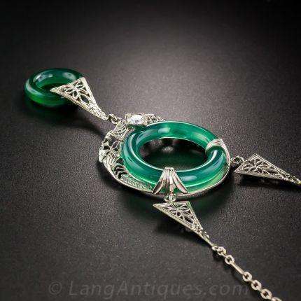 This colorful, striking and highly distinctive Depression-era jewel, die-struck in lacy 14K white gold filigree, features a pair of slender, bright translucent green donuts (dyed chalcedony), accented with a single diamond sparkler. The original chain with fancy terminals measure 15+ inches, the pendant measures 1 7/8 inches.