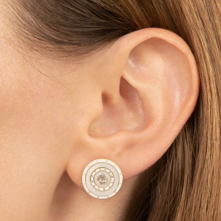 Shades of white. Sparkling with bright, chunky old mine-cut diamonds, these stylish Art Deco disk earrings (formerly a pair of cuff links) gleam with concentric circles of shimmering mother-of-pearl and white enamel decorated with small gold enamel dots. Circular chic. Total diamond weight, .25 carat. In 18K yellow gold.