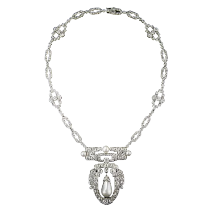 Radiant and ravishing. This truly exquisite necklace, hailing from the peak of the Art Deco period - circa 1925, although unsigned, is worthy of the finest jewelry houses. Centering on a lustrous white, natural saltwater pearl drop, measuring 18.70 by 10.60 millimeters (just over 3/4 inch long with the cap). This rare ocean gem swings freely from within an artfully designed centerpiece that suspends from a classic geometric link necklace, all of which sparkles with just shy of 20 carats of bright-white European, rose, and single-cut diamonds.diamonds, plus three round accent pearls. This important, impressive and entrancing Art Deco masterpiece measures 15 inches, and the center pearl section drops down just over 2 inches. The necklace is accompanied by a Gemological Report from the GIA (Gemological Institute of America).