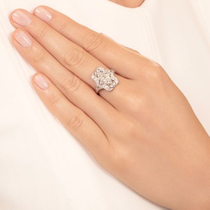 The best kind of puzzle? The one with diamond pieces, of course! This Art Deco dinner ring is an exquisite assemblage of crisp geometric shapes set with lively European and single-cut diamonds that fit perfectly together around a center .70-carat European-cut diamond. This bright stone is accented north and south with a single-cut diamond, all framed by a border that creates a contrasting, curvy navette shape. Millegrain edging throughout and hand-engraved neoclassical designs on the shoulders add finishing detail. Total diamond weight, 1.20 carats. Hand fabricated in platinum, circa the 1920s, it is currently ring size 6 3/4.