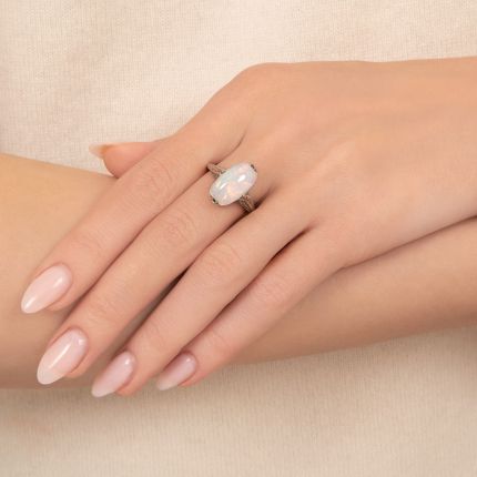 A magical and marvelous wonderland for your finger. This enchanting Art Deco jewel presents an oval cabochon opal that captivates with a play-of-color in vibrant iridescent hues of blue, green, orange, and yellow. The enchanting gem rests atop an exquisite, intricately-worked filigree side gallery with a remarkable rise, all supported by shoulders fashioned with a louvered design and embellished with a graceful scroll motif. Sublime. Die-struck in 14K gold, circa 1920s (the opal is a later replacement), currently ring size 5.