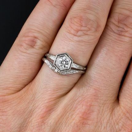 A bright and blazing .35 carat European-cut diamond appears considerably larger by design in this stylish, beautifully crafted platinum engagement ring. The top of the ring frames the diamond in hexagonal, concentric frames accented with delicate milgrain, and then reveals lacy, lattice-pattern filigree on the side views. Romantic, hand-engraved wheat and acanthus scroll details complete the look. Enchanting! In a finger size 6. This ring is shown with a floral contoured band that can be purchased separately. Please contact us for further details.