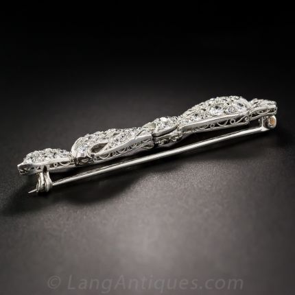 Make a gift to and of yourself with this festive sparkler, artfully sculpted in platinum in the form of a bow, and smothered with 3.50 carats of bright white, high-quality European-cut diamonds. The flowing negative spaces between the ribbons add extra visual interest when worn with dark colors. Two-and-a-half inches long, and one of the loveliest, original Art Deco (circa 1925) bow pins ever.