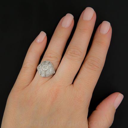 From the Roaring 20s comes this bombe-shape bauble, superbly handcrafted in platinum and shining front and center with a bright .46 carat European-cut diamond. The beautiful diamond crowns a gracefully domed top adorned with an array of sparkling old mine-cut diamonds set in finely milgrained geodesic settings. This dazzling Deco dinner ring measures about 11/16 of an inch high and is a ring size 6 1/2.