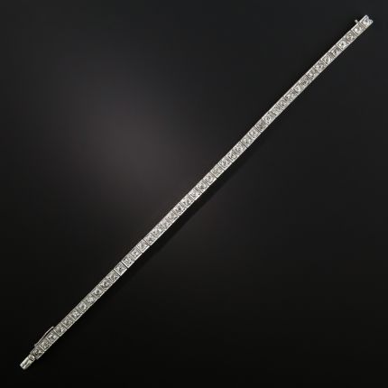 Hand fabricated in platinum during the peak of the Jazz Age - circa 1920s, forty-five bright-white old mine-cut diamonds, together weighing 3.50 carats, sparkle end-to-end from within delicate milgrained box settings adorned on both sides with decorative hand engraving, in this classic Art Deco line bracelet measuring 7 3/4 inches long. Stunning when worn alone or stacked with other bracelets.