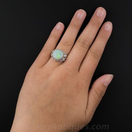 This unique Art Deco delight is crowned with a bright button shape opal imbued with a shimmering palette of predominately green and violet flashes. The enchanting gemstone glistens and glows atop a stunning, geometrically pieced mounting, hand-fabricated in platinum during the 1920s-30s, sparkling all around with bright white European-cut and single-cut diamonds. Singular and stunning, Over 1/2 inch wide, currently ring size 6 1/2.