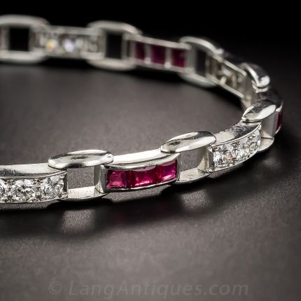 A sleek, chic and eminently wearable platinum link bracelet, circa 1930, in the signature Oscar Heyman style (it most likely is theirs but no marks remain). The classic design alternates with bright red, square-cut Burmese rubies (21 total = 2.50 carats) and bright-white and sparkling, high-quality European-cut-cut diamonds (21 total = 2.00 carats). This stunning Art Deco bracelet has a hidden fold over clasp and measures 7 long.