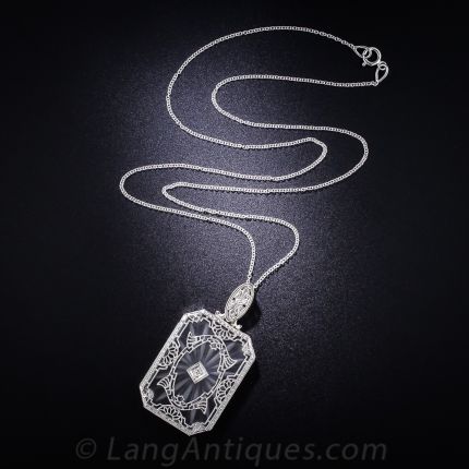 A translucent quartz crystal plaque imbued with a radiant cut-crystal carving is overlaid with delicate white gold doily work and centered with a small single-cut diamond. This fanciful and feminine pendant, circa 1930, measures 1 1/2 inches with the matching loop. The new chain measures 16 inches.
