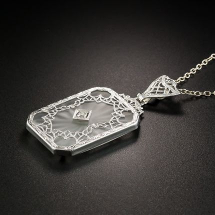 From the 1930's Depression-era comes this light and lovely frosted carved quartz crystal pendant overlaid with delicate 14 karat gold filigree and suspended from a matching bail. A small single-cut diamond glistens at the center. 1 1/2 inches by 11/16 inch. The white gold chain measures 16 inches.