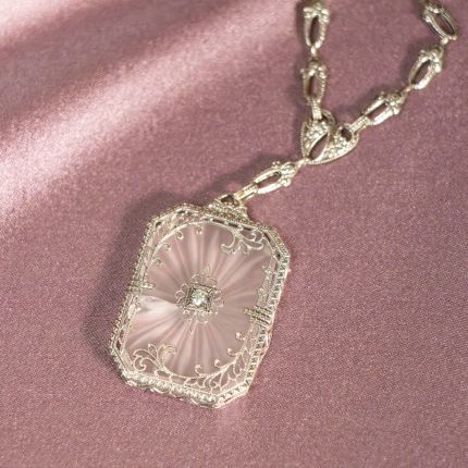 White gold 'lace' of 14K white gold creates a fanciful frame around a frosted rock quartz crystal plaque, carved on the reverse with a starburst design and pierced in the center with a twinkling European-cut diamond. The luminous Depression-era classic suspends from a 16 1/2-inch fancy link chain via a matching filigree bail. An ethereal beauty.