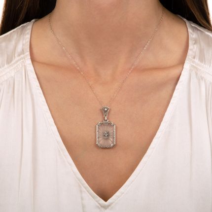 Delicate 14K white gold lacework creates a fanciful frame around a frosted carved rock quartz crystal starburst, pierced in the center with a twinkling single-cut diamond. A classic Depression-era (circa 1930) pendant necklace with matching filigree bale. 16-inch chain.