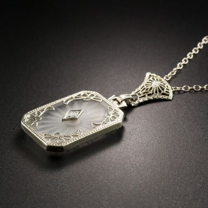 An elongated octagonal rock quartz crystal plaque, sparkling at its center with a single diamond, is set in a millegrain edged frame and accented at each corner with a dainty bow design. The pendant suspends from a finely detailed filigree bail--a work of art unto itself-- and its original 16 1/2-inch chain. An Art Deco delight. Rendered in 14K white gold, pendant measures 1 7/16 inches by 5/8 inch.