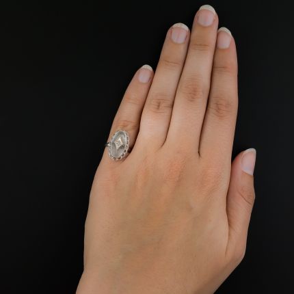 This Depression-era delight, dating from the 1930s, features a shimmering, elongated oval, frosted rock crystal quartz plaque pierced in the center with a tiny twinkler and fancifully framed in bright and sturdy 10K white gold. 3/4 inch, Currently ring size 4 1/4.