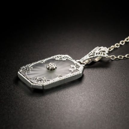 An octagonal rock quartz crystal plaque, accented at its center with a tiny white gold flower, is set in a decorative edged frame and embellished at each corner with fanciful flourishes. The pendant suspends from a finely detailed filigree bail, which loops over a 16-1/2 inch chain. An Art Deco delight. Rendered in 14K white gold.