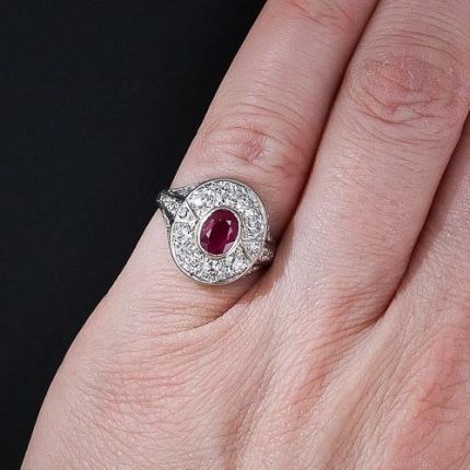 A richly saturated, bright-red Burmese ruby, weighing about .80 carat, radiates from the center of a sparkling, bright-white European-cut diamond frame in this classic, Art Deco jewel - circa 1930. The shoulders and undergallery of the platinum mounting are further adorned with smaller European-cut and single-cut diamonds set off with decorative geometric openwork. A sleekly tailored, and all-original Art Deco treasure.