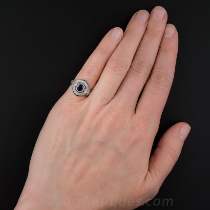 Expertly and exquisitely hand-fabricated in platinum, this early-Art Deco gem, circa 1920s, blends design elements of the preceding Edwardian era. A dark royal blue faceted oval sapphire, weighing three-quarter carats, floats inside a radiant pierced design adorned on each side with diamond-set tulip motifs, all enclosed within a double border of sparkling white European-cut diamonds followed by slender rows of calibre sapphires. Decorative hand-engraving and fine milgraining add the finishing flourishes to this exemplary, original, early Jazz Age jewel. Currently ring size 4 3/4+.
