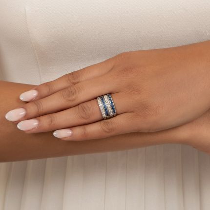 Dating back to the 1920s-30s, four separate tapered Art Deco bands are melded together at the base to create this fabulous half-inch wide finger-hugger. Curved rows of seamlessly-set, square-cut cornflower-blue Ceylon sapphires alternate with rows of sparkling white European-cut diamonds, all of which are set in hand fabricated and hand engraved in platinum bands. A lovely layering of blue and white. Total diamond weight - .75 carat, total sapphire weight - 1.50 carats. Currently ring size 7 1/4. Note: there is a small piece of white gold in the rear that was used to size the ring.