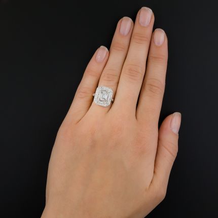 What a cool contrast. In this Art Deco style ring, big, bold flashes of light emanate from the exceedingly white 1.01-carat center emerald-cut diamond, while tiny diamonds glitter all around it in lamé-like fashion. For good measure a single accent diamond twinkles on each shoulder. Fab flash! Total diamond weight, 1.34 carats. Center stone accompanied by a GIA Grading Report stating: E - color; SI1 - clarity. 9/16 by 7/16inch. Hand fabricated in platinum, currently size 6.