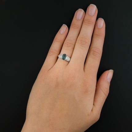 Remember the 1970's mood ring--the stones changed color depending on your mood. While not nearly as mercurial as the faddish rings from that era, the chameleon-like Alexandrite in this distinctively designed Art Deco style ring does change color--between two richly saturated hues of reddish-purple and deep teal green--depending on the light source. This intriguing stone is highlighted by shoulders adorned with a tapered baguette, gleaming between trios of tiny twinkling round brilliant-cut diamonds. Sleek, stylish, and it won't betray your poker face. Alexandrite weight, 1.00 carat; total diamond weight, .27 carat. Hand fabricated in platinum, currently ring size 5 1/4.