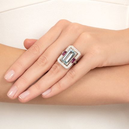So simple and uncomplicated. Yet, straight lines plus crisp angles create exceptionally striking designs. This Art Deco-style ring is a captivating example of such a collaboration. A superb 5.50 carat rectangular light pastel-blue aquamarine is surrounded in shimmering contrast by a diamond-set octagonal frame, punctuated by pairs of cherry-red square-cut rubies, all together creating an elegant geometric assemblage that graces the top of a slender platinum shank. Subtle details on the shoulders and a lacy undergallery add the finishing flourishes to this arresting jewel of color and sparkle. Total diamond weight - .65 carat, total ruby weight - .65 carat. Hand fabricated in platinum, it is currently ring size 6 1/2. Condition note: one ruby has a small nick.