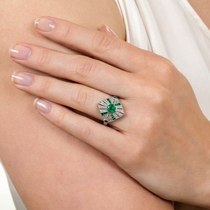 A beautiful bright octagonal Colombian emerald, weighing .56 carat, bezel-set on the bias, casts a vibrant rich green glow from within a radiant design of sparkling diamond-set rays, accented with seamlessly-set calibre emeralds, in this superb and strikingly stunning Art Deco style jewel. Expertly hand fabricated in platinum with meticulous attention paid to each and every decorative detail, delicate milgraining throughout, and a hand engraved side gallery and shoulders add the finishing flourishes. Total emerald weight, .87 carat. Just under 3/4 inch. Currently ring size 7.