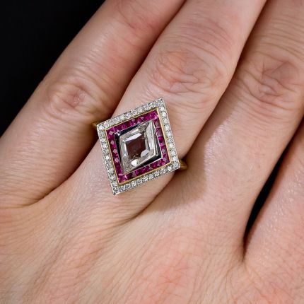 A unique and stunning jewel, crafted in homage to enduring Art Deco style and featuring an unusual diamond-shape (as in playing cards or baseball) step-cut diamond, framed concentrically with gorgeous calibre French-cut rubies and glittering full-cut diamonds. For added dramatic effect, the diamond is delicately outlined in black enamel. Beautifully crafted in platinum atop rich, hand-engraved 18 karat gold, in a finger size 6 1/2.