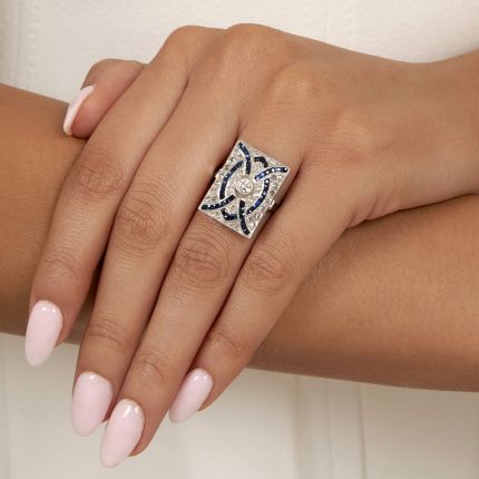 Evocative of elegant tilework, the top of this striking Art Deco-style ring presents a crisp rectangle aglitter with modern rose- and single-cut diamonds, with a bright round brilliant cut shining at its center. A marquise shape and a stylized 'X' set with deep blue calibre sapphires add curvy contrast to this eye-catching jewel. Total diamond weight - .70 carat, total sapphire weight - 1.10 carats. Hand fabricated in platinum, it is currently ring size 9.