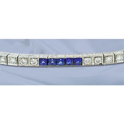 Platinum Art Deco style sapphire and diamond straight line bracelet featuring alternating groups of French cut sapphires (33 total, 4.00 carats total weight) and round brilliant cut diamonds (28 total, 1.00 carat total weight, F-G color, VS1-SI1 clarity) finished with milgrain trim and fully engraved sides. This bracelet measures about 7 long.