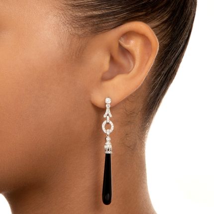 Measuring a quite dramatic (and glamorous) 2 and 5/8 inches long, these 'swinging' Art Deco-style drop earrings, brought to you in glorious black & white, begin with with sparkling diamond-set geometrically designed tops and culminate in slender glossy black onyx drops. Sophisticated and stunning. Any basic black in your closet?