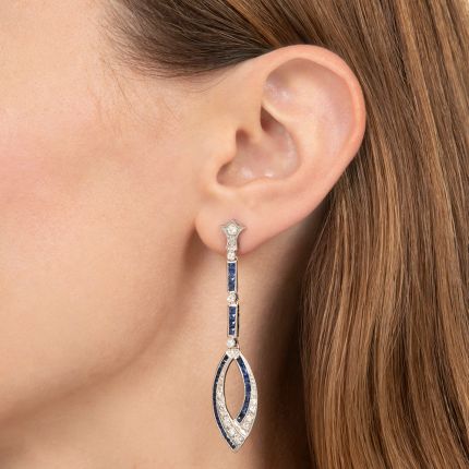 The allure of the dazzling, long, gem-encrusted geometric earrings of the Art Deco era endures. And no wonder. They have a timeless elegance and represent a free-spirited attitude that still appeals to jewelry lovers today. These fabulous dangle earrings, faithfully created in the aesthetic of the era, feature navette shapes set with sparkling round brilliant-cut diamonds and calibre sapphires that connect to articulated columns of sapphires and diamonds, all swinging and swaying beneath diamond-set posts. Forever chic. Total diamond weight - .90 carat, total sapphire weight - 2.20 carats. Crafted in platinum. Condition note: one diamond has a chip.