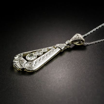 A trio of bezel-set diamonds swing freely and sparkle brightly within an elegant neoclassical style pendant rendered in embossed and finely milgrained platinum over 14K gold and dotted with a handful of tiny glinting rose-cut diamonds, in this delightful 1 1/2-inch long and lovely Art Deco style pendant necklace.