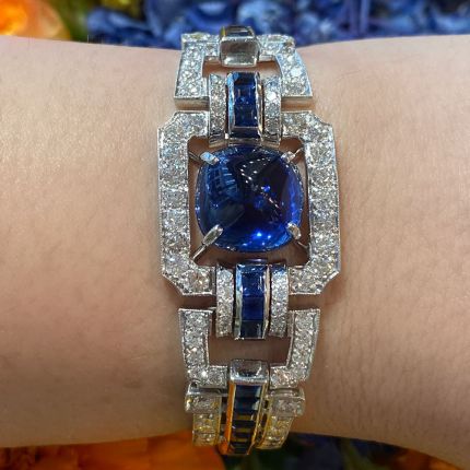 A liquid, royal-blue 'sugarloaf' cabochon sapphire, weighing 13.69 carats, floats in the center of this sensational Art Deco bracelet, substantially crafted in platinum - circa 1930s. The bracelet sections feature a gently graduated line of vivid, deep blue sapphires - most likely of Burmese origin - weighing 9.00 carats total. These are bordered by sparkling, bright white transitional-cut diamonds weighing 7.75 carats. Center sapphire accompanied by a GIA Gemological Report stating: Natural, heated - Origin, Sri Lanka. A regal and radiant beauty in glorious blue and white.