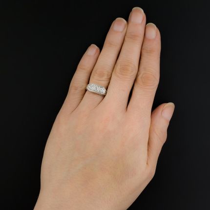 A trio of bright white and sparkling European-cut diamonds, together weighing .40 carat, radiate shoulder-to-shoulder from within triple-milgrained settings, supported all around by a striking architectural side gallery, in this consummate Art Deco classic. Beautifully hand fabricated in platinum, circa 1920s-30s. Currently ring size 4 3/4.