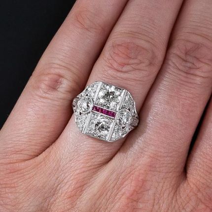 Two diamonds are better than one, and four are better than two! This majestic, original Art Deco double-decker dinner ring, masterfully crafted in platinum - circa 1920s-1930s - glistens front and center with bright and lively pair of European-cut diamonds, together weighing 1.75 carat, and on the sides with a smaller pair of European-cut diamonds totaling 1.00 carat. The ring is bisected in the center with bright-red calibre ruby accents and each diamond-set shoulder shimmers with a straight baguette diamond leading down to an embossed acanthus leaf motif on the upper half of the ring shank. A dazzling and distinctive Art Deco delight. 3.50 carats total diamond weight. Ring size 6 3/4.