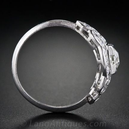This is a sleek and low profile ring from the Art Deco period from Whitehouse Bros. A .40 carat European cut diamond is set in a square box setting and fully surrounded by accent diamonds finished with fine milgrain detailing. An easy to wear, stand alone ring. Stamped 'W' for Whitehouse Bros and inscribed with the initials 'A.P.H.'.