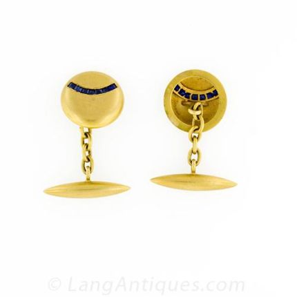 Elegant, Art Deco 18k yellow gold cufflinks are accented with a simple moderne curved channel of striking blue synthetic sapphires.The cufflinks have a subtle satin finish, and have been fitted simply with a chain and bar mechanism.The slightly domed surface measures a bit over 1/2 in diameter.Synthetic Sapphire Description:15 square faceted sapphires: 0.35 carat total weight