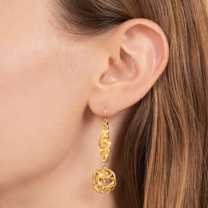 When you have the body, tail, and back legs of a lion, the head and wings of an eagle, and an eagle's talons for front feet, you need to move around a bit. So, these griffins—finely handcrafted and engraved in 18K gold—made their move from a pair of Art Nouveau cuff links to a pair of chic, super cool earrings. They connect to sleek ear wires by way of sculptural leafy vines (yet another former pair of cuff links—we're so clever!), and now they can swing about freely at your lobes. Circa 1890-1900. Note: Due to their former incarnation as cuff link, they are not a left and right pair (both griffins face the same way).