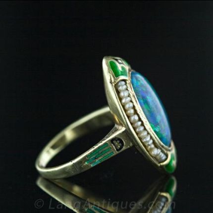 Art Nouveau Black Opal, Enamel and Seed Pearl Ring
