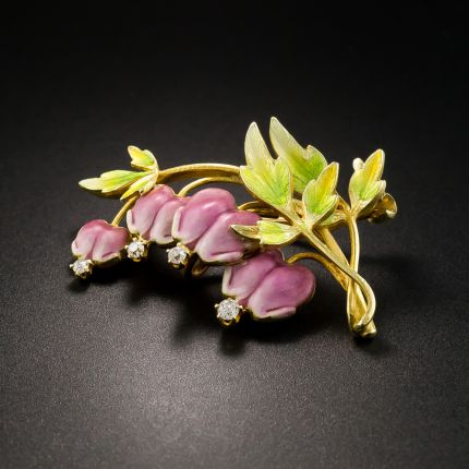 As sweet as can be, four diamond-tipped bleeding heart flowers (Lamprocapnos spectabilis*) colored in shaded pink enamel, blossom above sinuous yellowish-green enameled leaves and golden stems. By the renowned jeweler, Krementz, Circa 1900. *A species of flowering plant in the poppy family Papaveraceae, native to Siberia, northern China, Korea and Japan. Measures 1 1/4 inches by 3/4 inch.