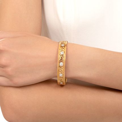 How lovely—a wrist trellis! Fashioned with a lattice-like design—complete with swirling, climbing hand-engraved vines—this alluring Art Nouveau bracelet shines with five bright-as-stars European-cut diamonds. A definite contender for your signature bracelet. Hand-fabricated and hinged, circa 1910, it measures 7 1/4 inches with an oval shape.