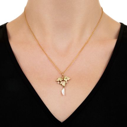 A sprig of flowers, hand engraved, colored with shimmering pastel enamel, and accented with a pair of pretty pearls and one tiny, glittering antique single-cut diamond give form to this lovely Art Nouveau lavaliere. The charming composition, further embellished by a shimmering freshwater wing pearl, suspends from a 17-inch chain. Sweet! Hand fabricated in 14K gold, circa 1900.