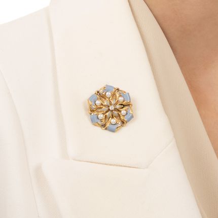 A beauty to behold, this Art Nouveau pendant/brooch is an alluring composition of pretty parts. A lively European-cut diamond twinkles in the center of slender petals surrounded by graceful gold vines, six freshwater pearls, and larger petals, while periwinkle enamel with a satiny finish adds subtle color. It's ready to bloom at your neckline or wherever you choose to pin it. Hand fabricated in 14K yellow gold, it suspends from an 18-inch chain. Note: the pearls are newer replacements.